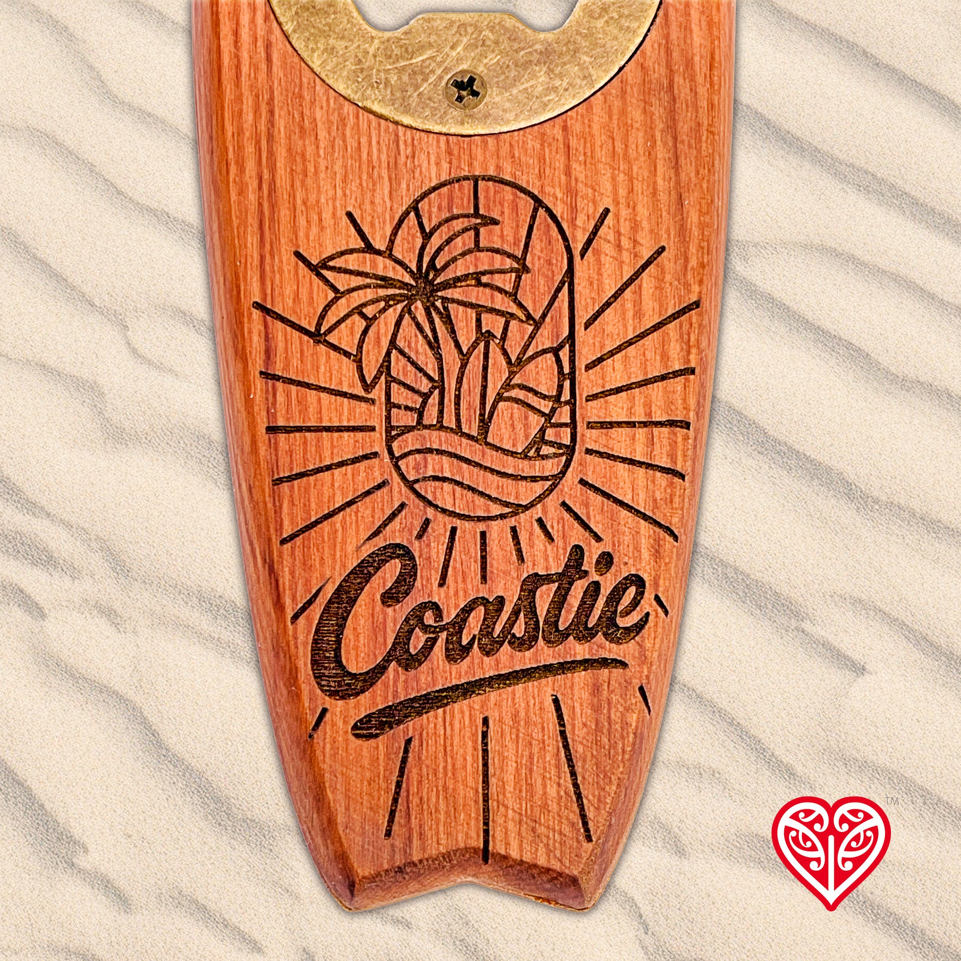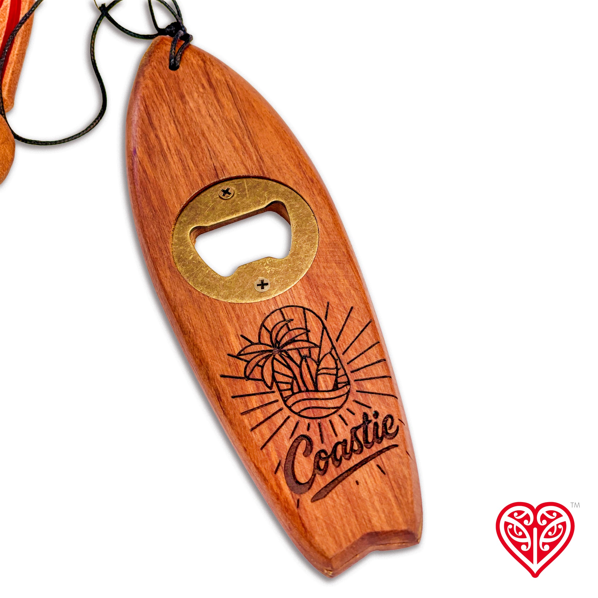 Our retro surfboard bottle openers are carved from reclaimed Rimu and Kauri — each one hand-painted using our leftover Resene test pots. Every piece is completely unique — no two are ever the same. Created by New Creation using reclaimed timber supplied by Plots & Pickles.