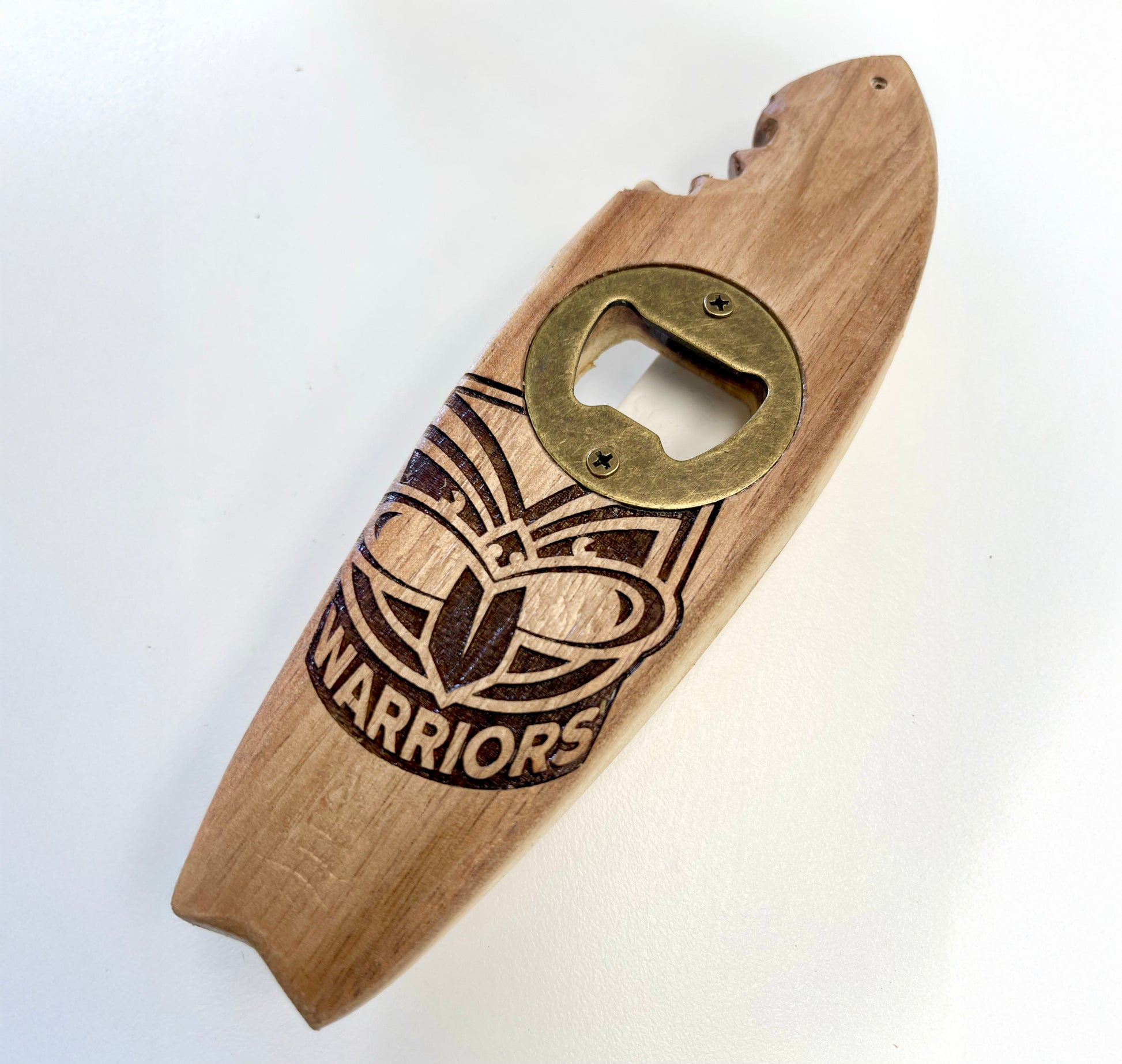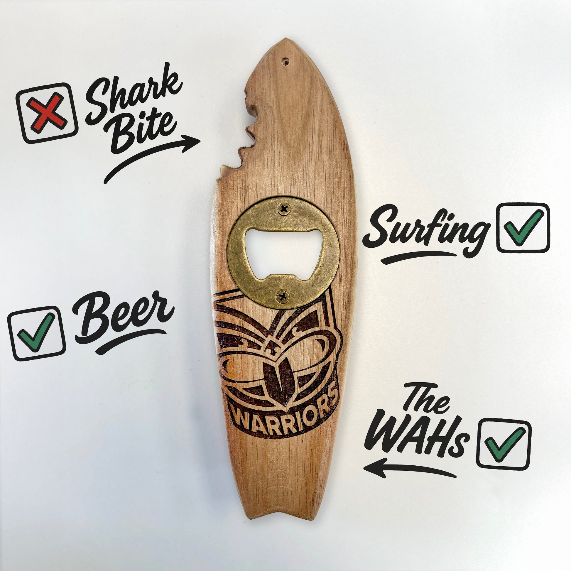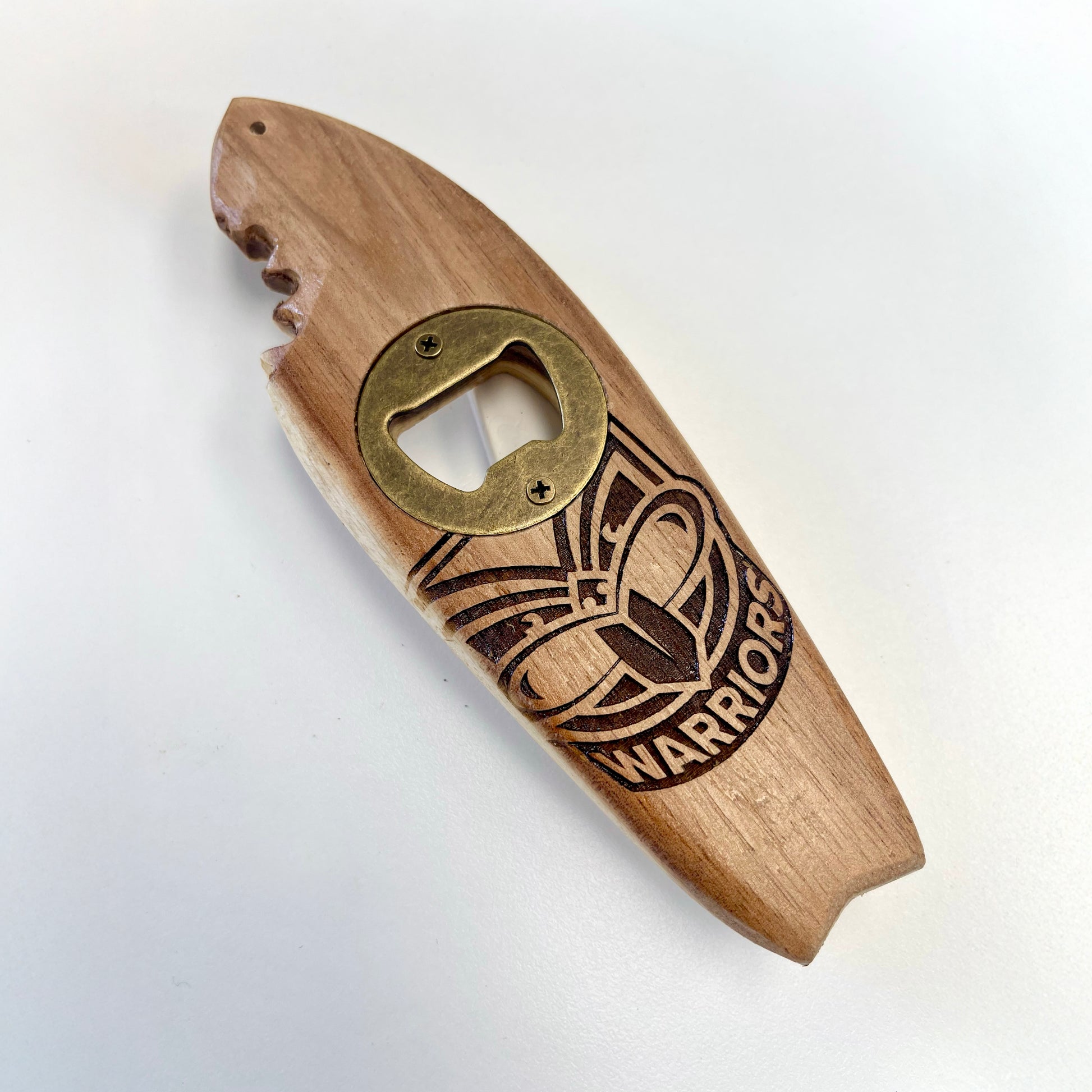 Handcrafted from reclaimed timber, these distinctive surfboard bottle openers feature the Warriors logo and measure approximately 170mm x 56mm.
